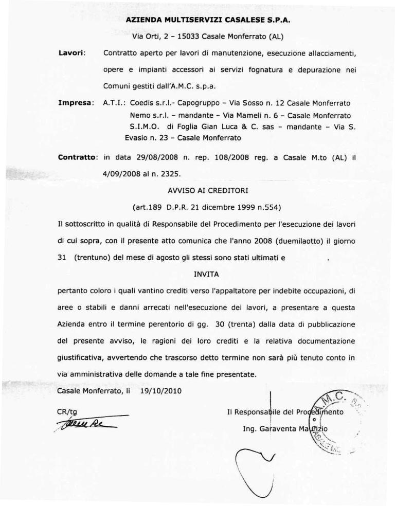 | Description | AMC SPA - Avviso ai creditori per lavori di manutenzione e allacciamenti servizi fognatura ultimati in data 31.08.2008 |