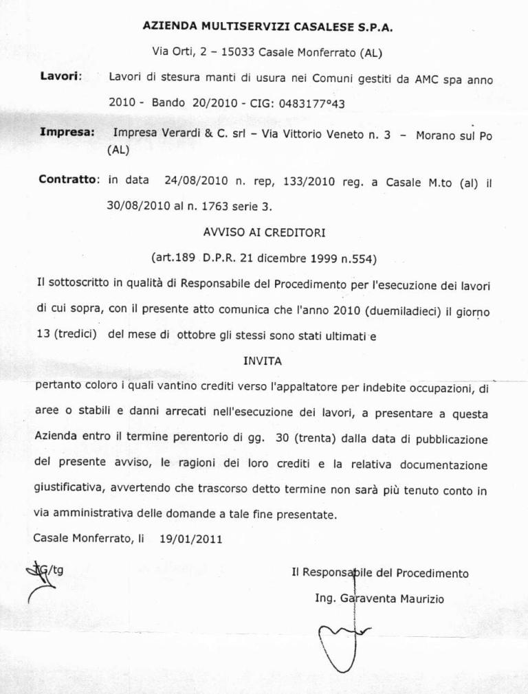 | Description | AMC AZIENDA MULTISERVIZI CASALESE SPA Avviso ai creditori relativi a lavori di asfaltatura nel Comune di Casale Monferrato. |