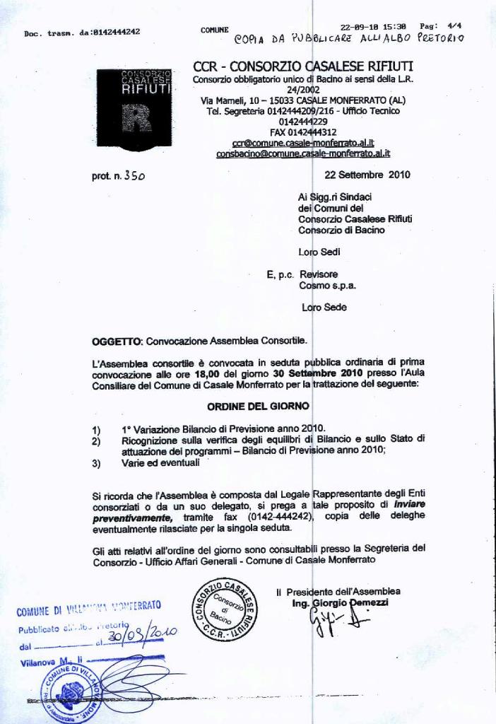 | Description | L'assemblea consortile è convocata per il giorno 30 settembre alle ore 18.00 per la trattazio dell'ordine del giorno allegato. |