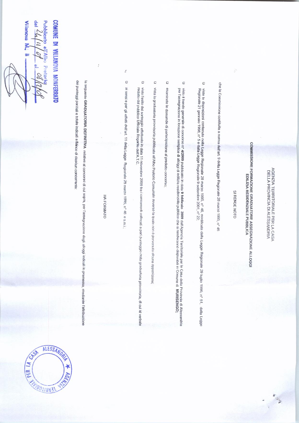 | Description | Agenzia Territoriale per la Casa di Alessandria Pubblicazione graduatoria definitiva per l'assegnazione di alloggi che si renderanno disponibili nel Comune di Murisengo |