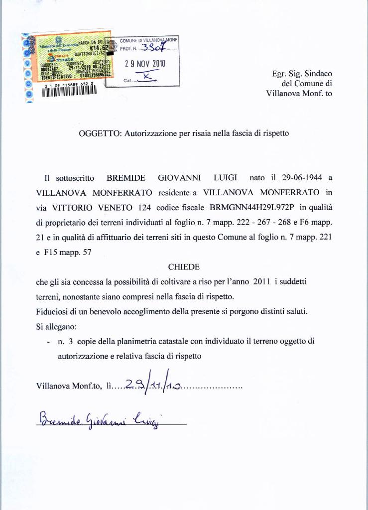 | Description | Richiesta autorizzazione alla coltivazione risaie in fascia di rispetto. Bremide Giovanni Luigi. |
