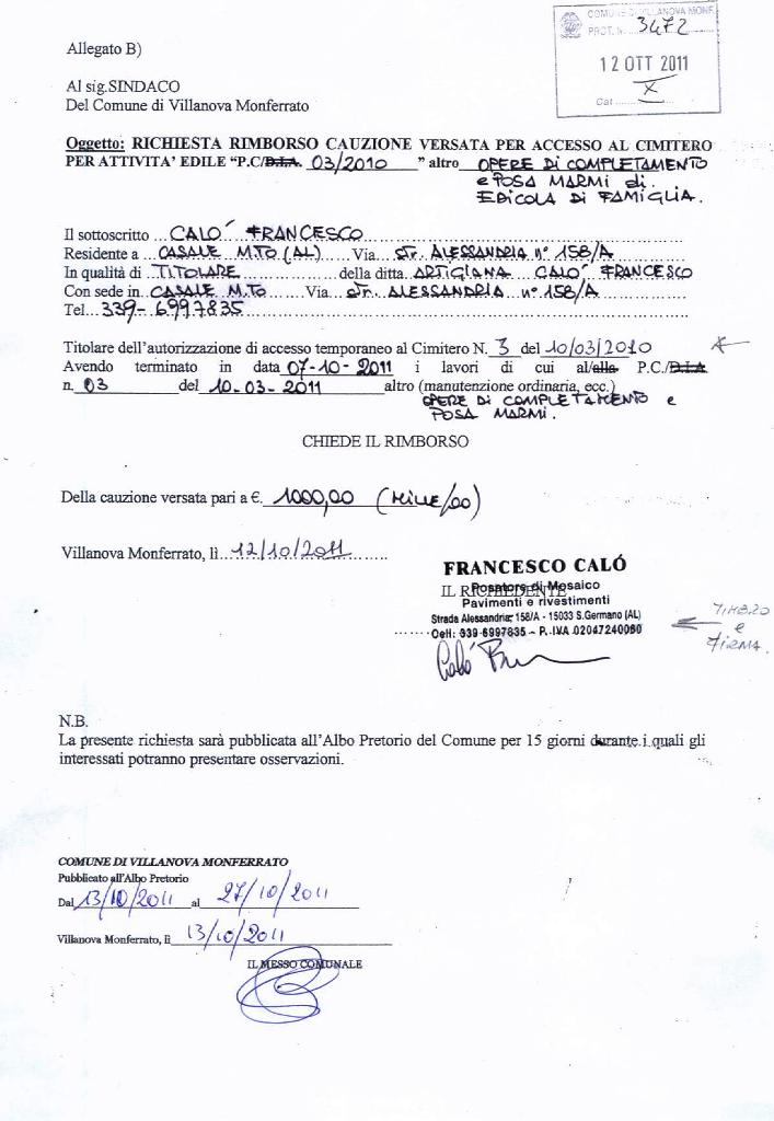 | Description | Richiesta restituzione deposito cauzionale per lavori effettuati presso il cimitero comunale. |