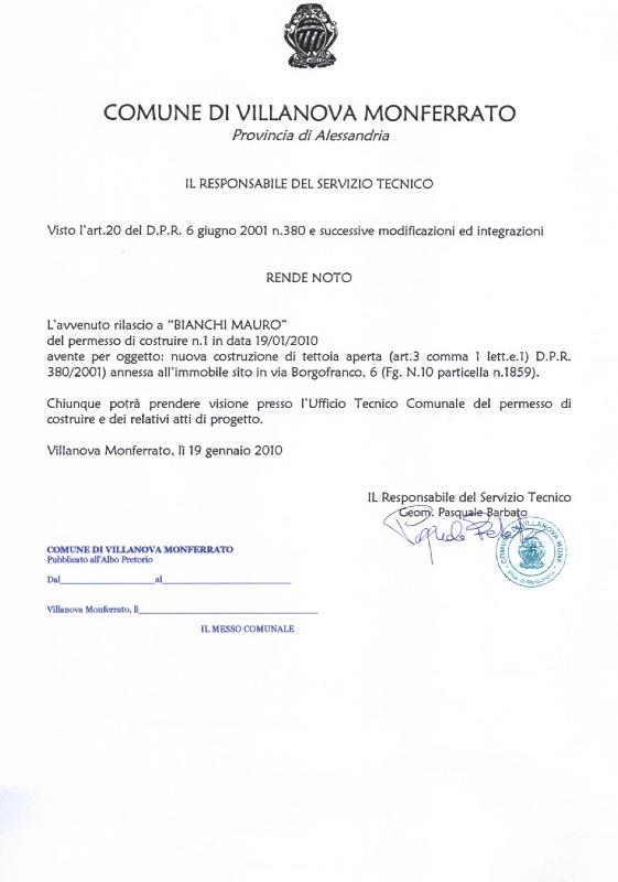 | Description | Avviso di rilascio PDC n° 1 per costruzione tettoia aperta. |