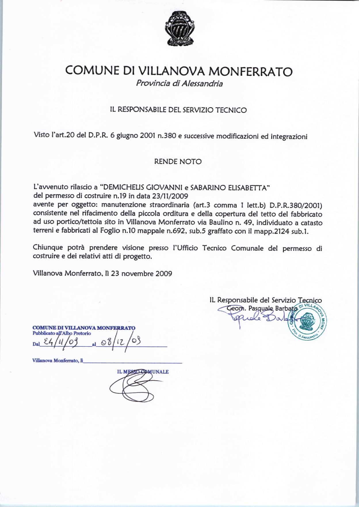 | Description | Rilascio permesso di costruire n° 19 DEMICHELIS GIOVANNI e SABARINO ELISABETTA |