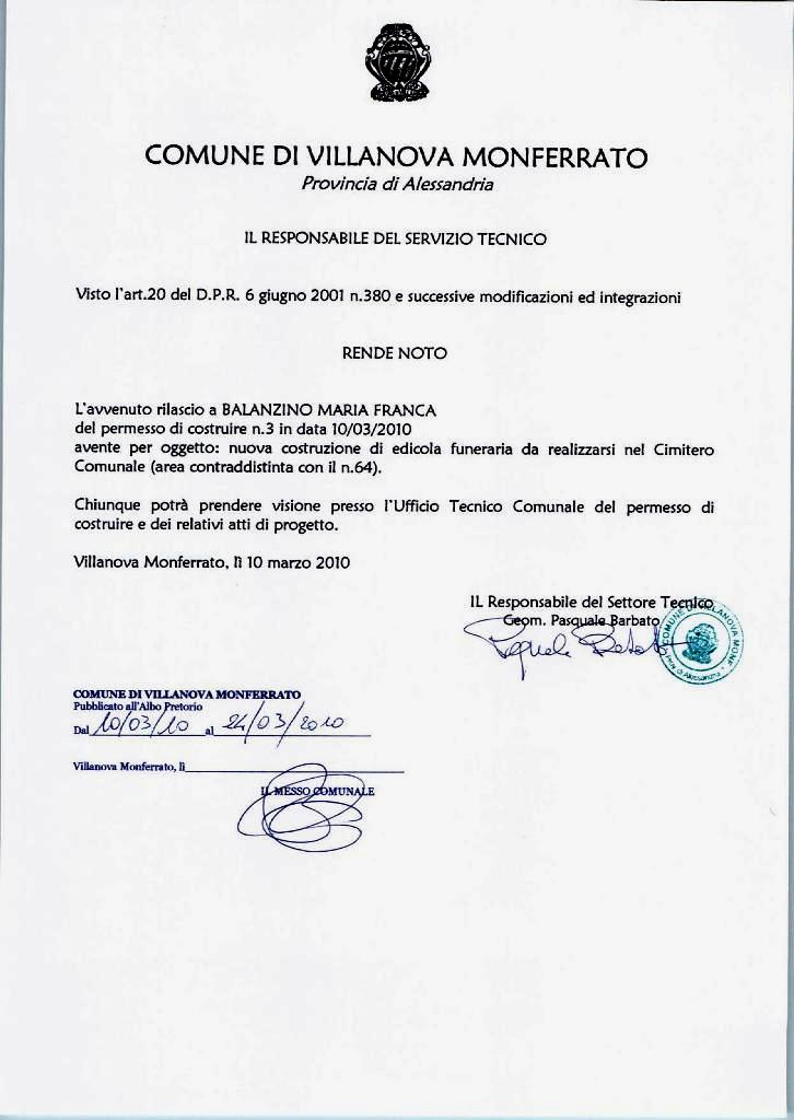 | Description | Avviso di rilascio permesso di costruire n°3 per nuova costruzione edicola funeraria presso il cimitero comunale. |