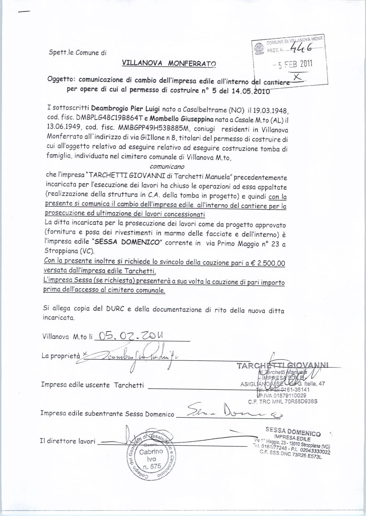 | Description | Richiesta svincolo versamento cauzionale impresa edile Tarchetti per cambio impresa cantiere di cui al permesso di costruire 5 del 14.05.2010 |