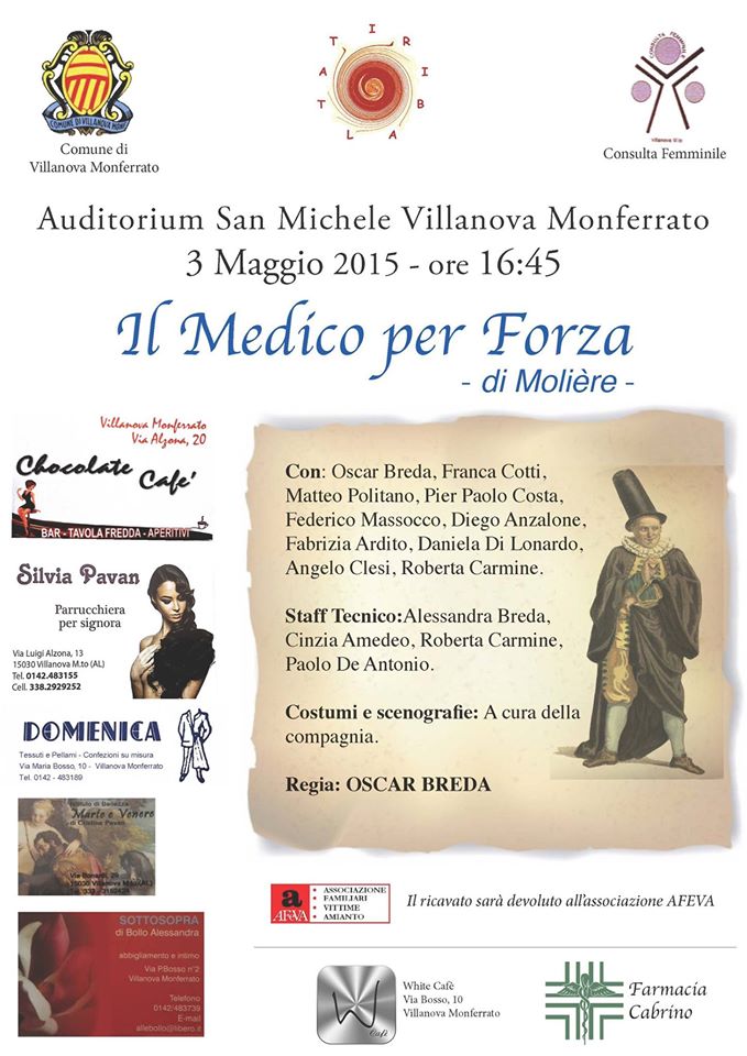 La consulta femminile di Villanova Monferrato propone, per domenica 3 maggio, lo spettacolo "Il medico per forza" di Molière, in collaborazione con IRibaltati teatro. Vi aspettiamo numerosi, a partire delle ore 16.45 presso l'Auditorium San Michele; ingresso a offerta, i proventi saranno devoluti all'AFEVA