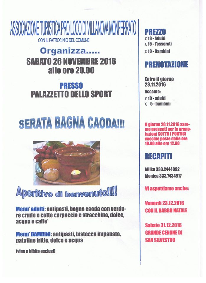La Pro loco con il patrocinio del Comune organizza " Serata bagna caoda " , una serata da passare tutti insieme in compagnia degustando uno dei tipici piatti della tradizione Piemontese .