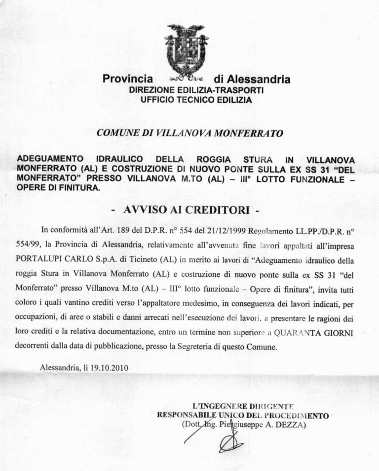 | Descrizione | Provincia di Alessandria - Avviso ai creditori III° lotto funzionale opere di finitura lavori di regimazione idraulica della Roggia Stura. |