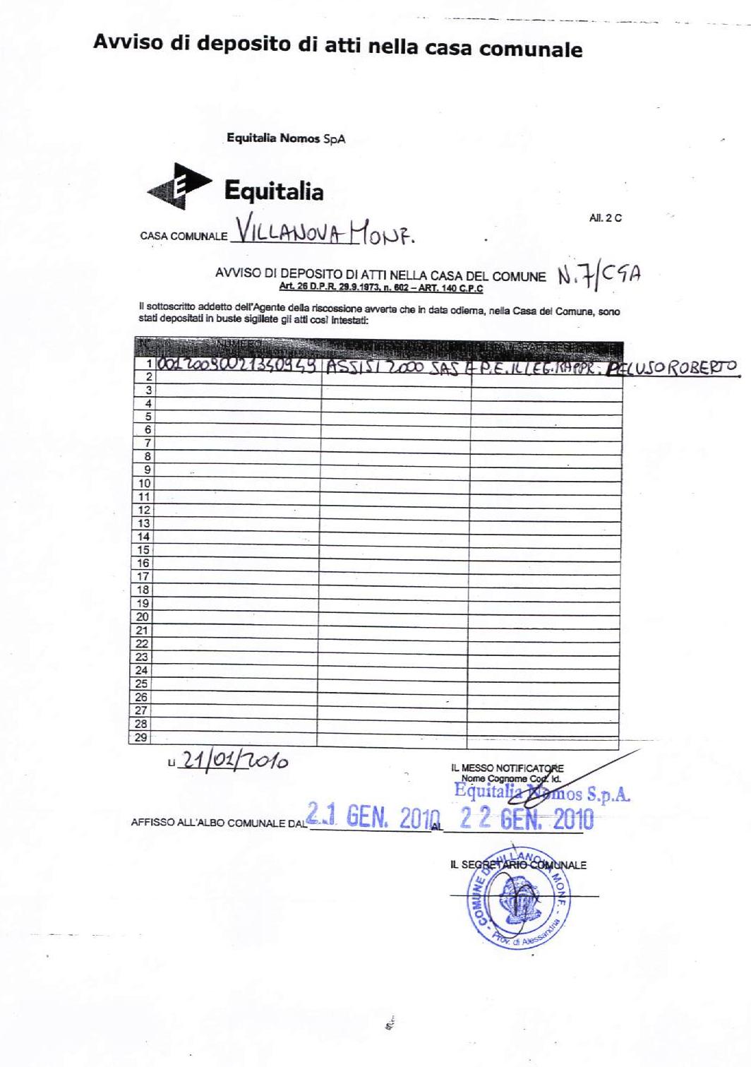 | Descrizione | deposito atti per la notifica ex. art. 140cpc Equitalia |