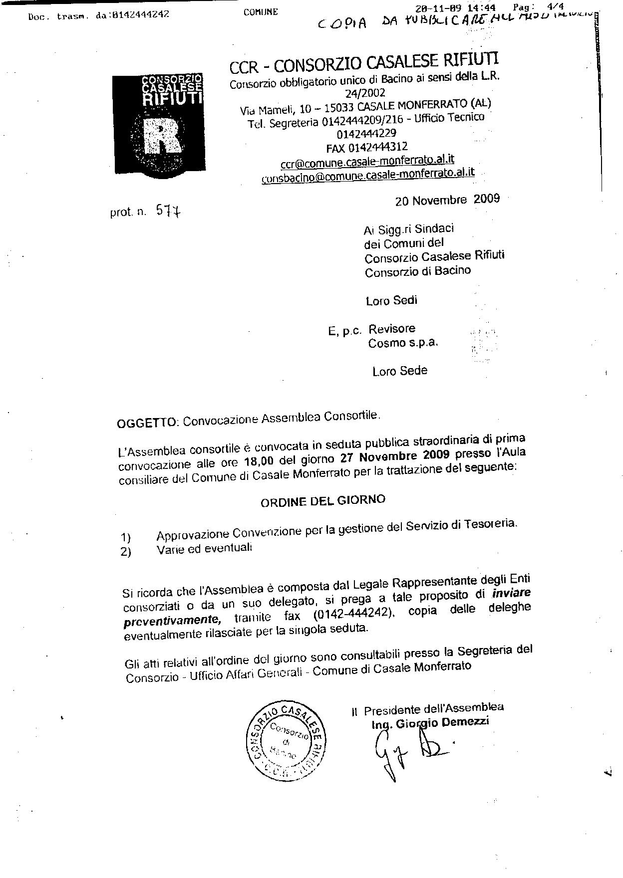 | Descrizione | Convocazione Assemblea Consortile CCR Consorzio Casalese Rifiuti. |
