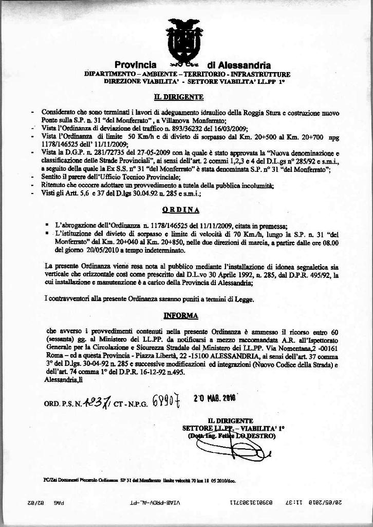 | Descrizione | ORDINANZA DISCIPLINA DELLA CIRCOLAZIONE STRADALE LUNGO LA EX SS31 70 KM/H NEL TRATTO IL KM 20+040 E IL KM 20.850 |