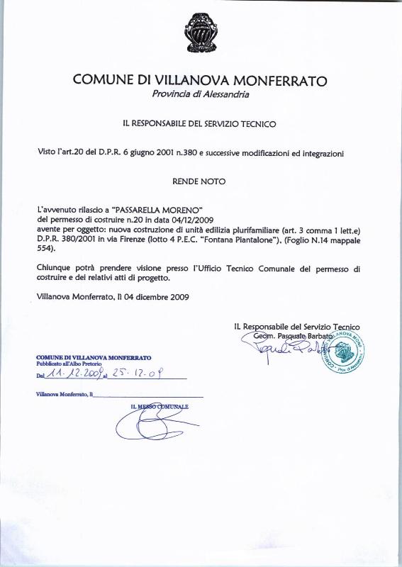 | Descrizione | Comunicazione di avvenuto rilascio permesso di costruire. Nuova costruzione unità edilizia plurifamiliare. |