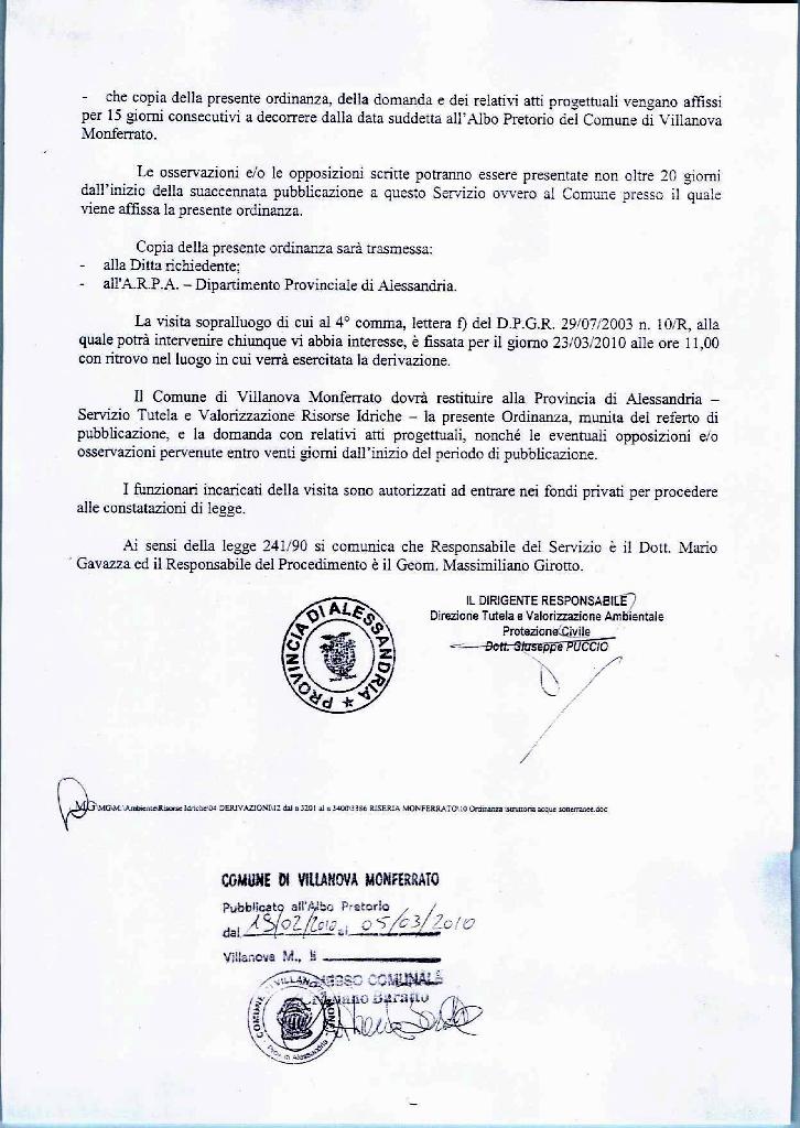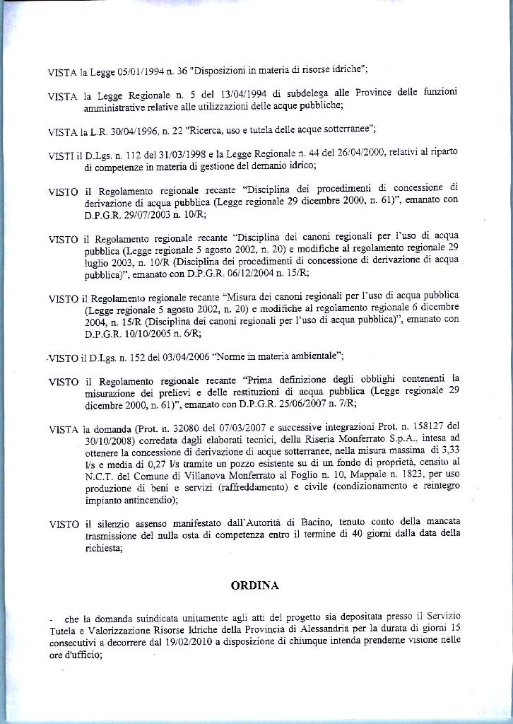Ordinanza Istruttoria Derivazione acque Provincia di AL