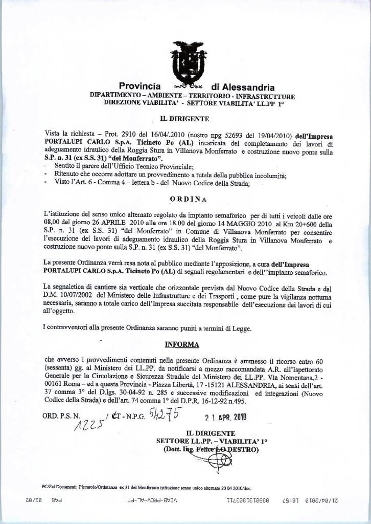 | Oggetto | Istituzione del senso unico alternato con regolazione semaforica sulla SS31 all'altezza del nuovo ponte sulla Roggia Stura. |