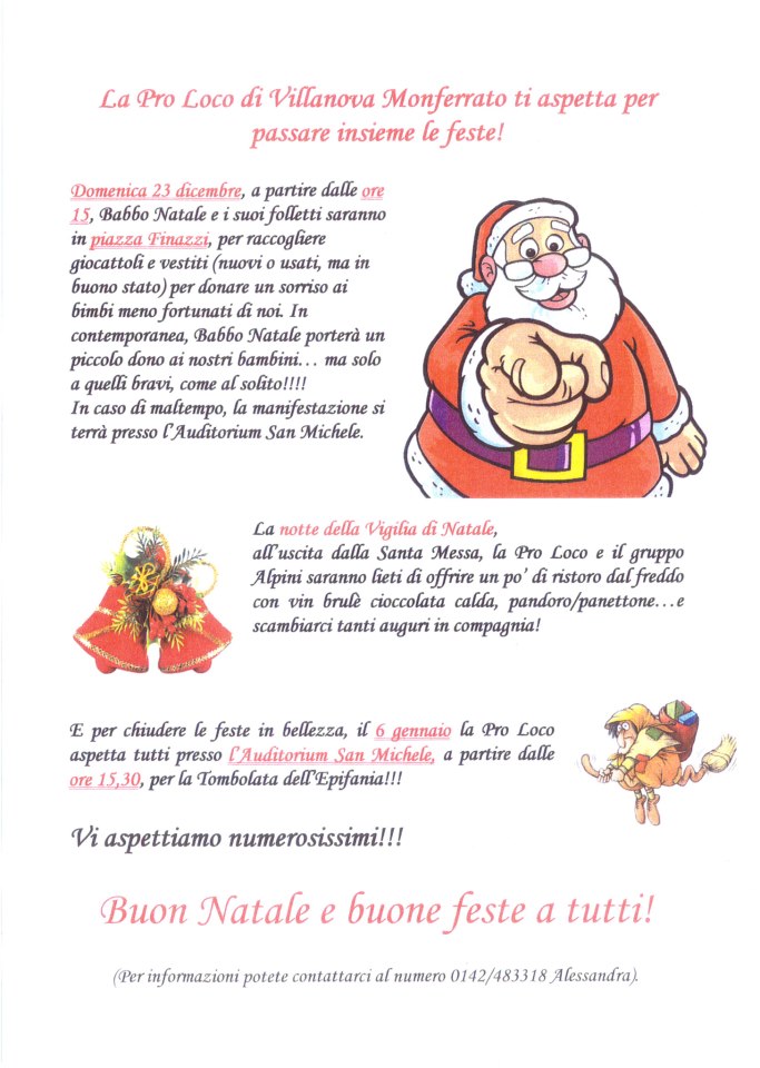 La manifestazione ha inizio domenica 23 Dicembre in Piazza Finazzi a partire dalle ore 15 con con la distribuzione dei doni ai bambini per proseguire poi dopo la messa di mezzanotte con lo scambio degli auguri Natalizi e la classica distribuzione del Vin Brulè e chiudere poi in bellezza il giorno 6 Gennaio 2013 a partire dalle ore 15:30 con la classica " Tombolata dell' Epifania " presso l' Auditorium San Michele di Villanova Monferrato ...vi aspettiamo numerosi